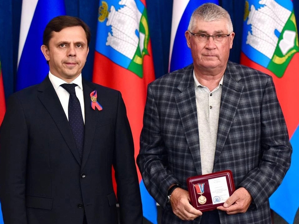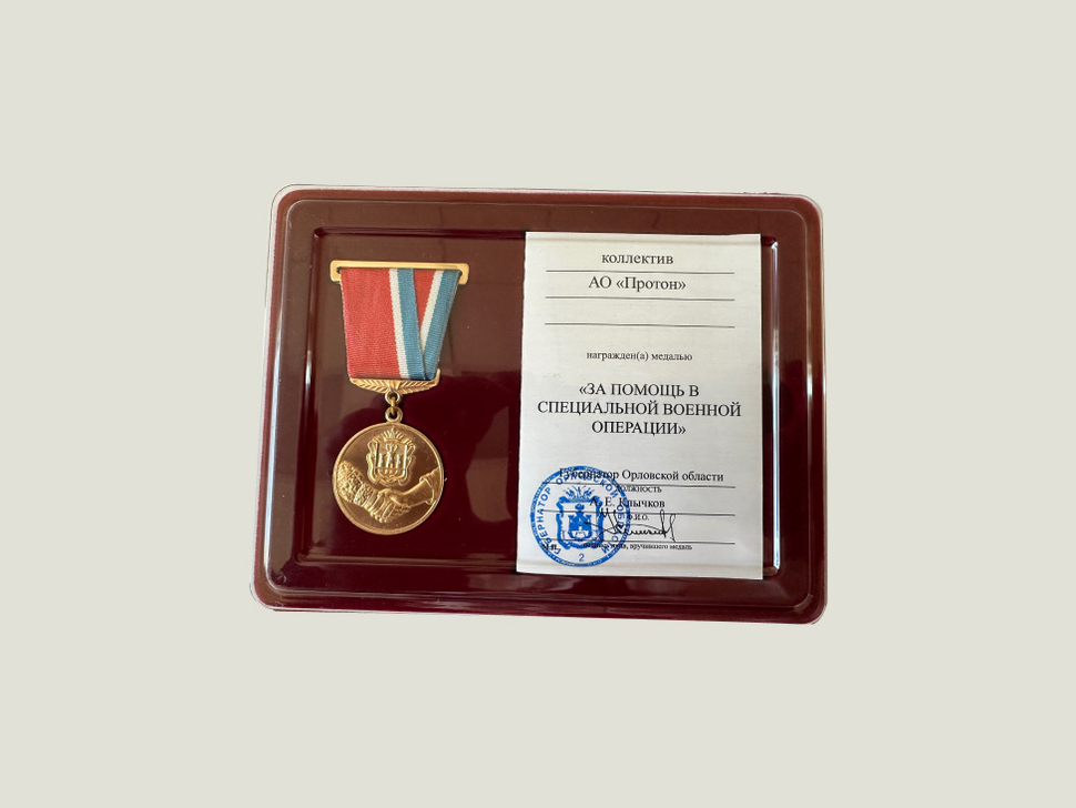 В торжественной обстановке Губернатор Орловской области Андрей Клычков вручил медаль «За помощь в специальной военной операции» представителю коллектива АО «Протон» генеральному директору Вячеславу Меньшову.