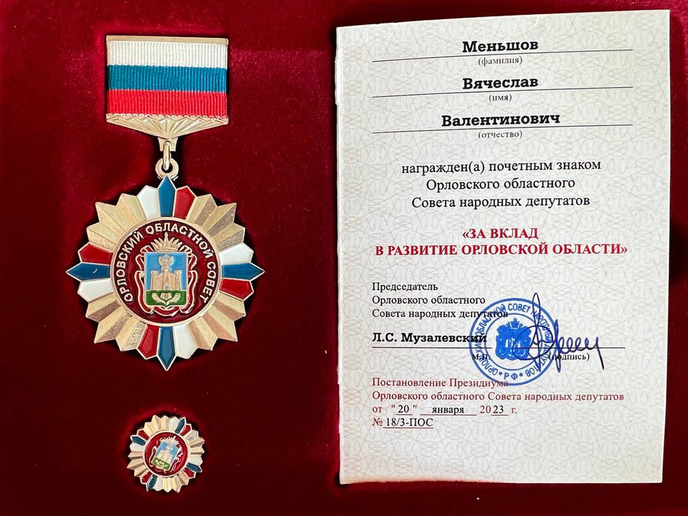Постановлением Президиума Орловского областного Совета народных депутатов генеральный директор АО «Протон» Вячеслав Валентинович Меньшов награжден почетным знаком «За вклад в развитие Орловской области».